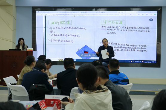何聚厚为新入职教师详细解读了数字化转型背景下教学重构创新设计的内涵和混合式教学设计的思路与流程,通过实践指导,阐明了“老师怎么教,决定了学生怎么学”的理念;详细介绍了混合式教学设计的原则与框架,分享了课堂提问技巧、过程性学习评价设计和学习小组创建的原则与方法,带领老师们进行了混合式教学设计实践,通过小组展示、同伴互评、专家点评等环节,让老师们现场体验了如何开展参与式互动教学。