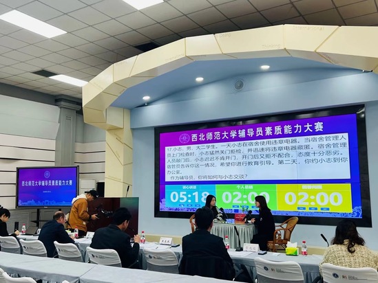 近日,西北师大举办辅导员素质能力大赛,全校辅导员参加。部分兄弟院校学工部长、团委书记等担任案例分析和谈心谈话环节评审,与参赛选手进行了深入的业务探讨。