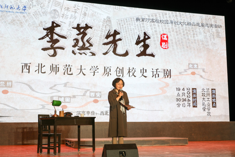 在五四青年节来临之际,西北师大原创校史话剧《李蒸先生》走进兰州城市学院、兰州工业学院进行专场演出,兰州城市学院党委副书记牟录贵,兰州工业学院党委委员、统战部部长张红岩出席活动并致词,西北师大团委负责人参加活动,两所高校师生代表共1200余人现场观看了演出。