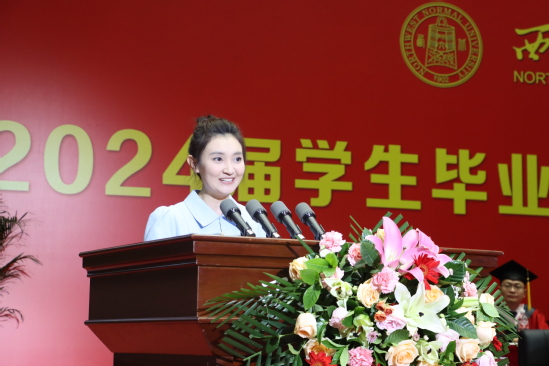 2024届本科毕业生代表、教育科学学院2020级教育学专业白燕在发言中表示,四年来,我们被西师精神、西师情怀和西师行动所滋养,见证了百廿师大事业的蒸蒸日上,见证了师大学子在不同领域中发光发热,见证了各学科向上向好的发展态势。在未来的日子里,我们每一位师大学子都将以更加饱满的热情和更加坚定的信念,为实现自己的人生目标而努力奋斗,为母校增光添彩而奋斗。