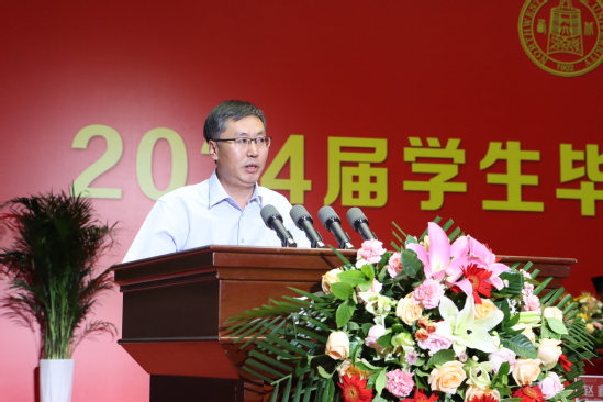 “图书馆、云衢楼珍藏着你们奋笔疾书、刻苦学习的身影;运动场、轮滑场闪耀着你们放飞自我、激扬青春的风采;水塔山下、如意湖畔记录着你们青春浪漫、天真无邪的时光。”在离别之际,王占仁深情寄语本科毕业生,希望你们带着知行合一的精神底色,秉诚守正,耕耘求索,像“云亭耕读园”奋力抽穗的小麦一样成长成才、生生不息,用青春年华奏响属于自己的慷慨与激昂,成为以德润身、矢志奉献的先行者;希望你们能够始终保持对知识的渴望和对真理的追求,在未来的道路上坚持学习,在求真求实中不断延展人生的厚度与宽度,把“学为人师,行为世范”作为一生的行为准绳和价值追求,把文章写在大地上,在不懈奋斗中实现人生价值,成为脚踏实地、行稳致远的攀登者;希望你们超越自我,胸怀“国之大者”,敢想敢为又善作善成,找到毕生热爱的事,与志同道合的人协作奋进,路遥而不坠其志,行远而不改初心,以独属于青年人的锐气与勇毅,积极拓展生命的格局,成为持之以恒、不懈奋进的开拓者。