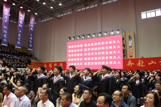 “做爱党爱国、信念坚定的西北师大人;做崇尚学术、追求卓越的西北师大人;做昂扬奋进、担当作为的西北师大人;做爱岗敬业、履职尽责的西北师大人;做温暖善良、感恩有爱的西北师大人。”在2020年“最美大学生”、传媒学院播音与主持艺术专业本科生赵德煜的带领下,全体毕业生庄严宣誓。