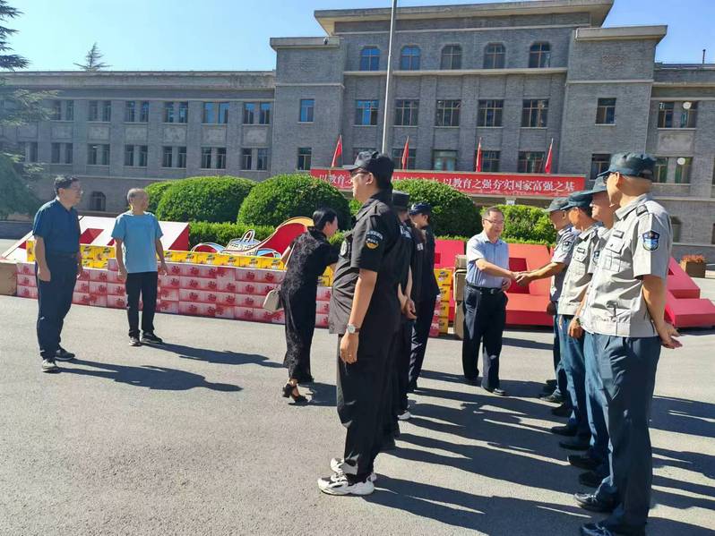 在党委保卫部门卫值班岗,王全进对暑期安全保障工作给予了充分肯定,无论在高温下的门卫值守,还是安全巡逻,大家都毫无怨言、坚守岗位。感谢同志们为师生提供的安全与稳定,叮嘱大家要注意做好消暑降温和自身健康防护,并代表学校送上防暑慰问品。