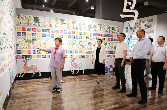 开幕式结束后,与会领导和师生代表共同前往展厅观展,并与AI机器人进行趣味互动。附属小学美术老师和学生讲解员为观展人员进行了详细生动的讲解。