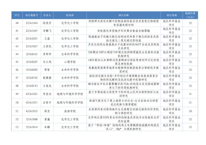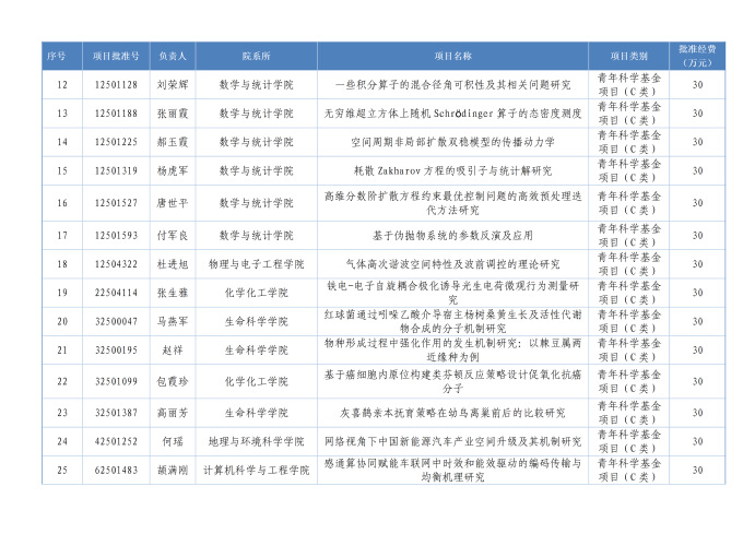 本年度获批项目分布于9个学院,分别是化学化工学院14项,物理与电子工程学院13项,数学与统计学院11项,生命科学学院10项,计算机科学与工程学院8项,地理与环境科学学院5项,管理学院2项,心理学院1项,旅游学院1项。