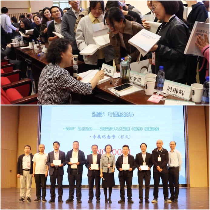 在颁奖与学者交流环节,专家学者、笔谈作者向参会青年教师分享了写作思考历程与研究难点,并在《高校青年人才发展报告》一书上签名留念,主办方为参会专家颁赠论坛专属纪念号。